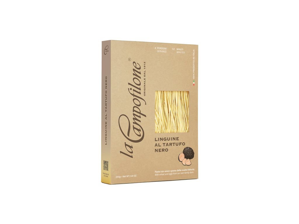 Vaječné linguine s výraznou chutí černého lanýže. Prémiová těstovina z regionu Marche s jemnou strukturou a rychlou přípravou za 1–2 minuty.