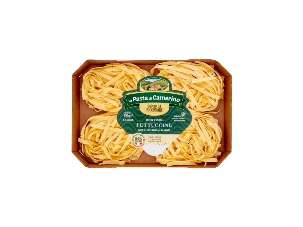 La Pasta di Camerino Fettuccine vaječné jsou prvotřídní těstoviny vyráběné dle autentické tradice regionu Marche. Jejich plochý a široký tvar s přirozeně drsným povrchem dokonale zachytává omáčky a zvýrazňuje chuť každého pokrmu. Těstoviny jsou připravovány ze 100% semolinové krupice z tvrdé pšenice a 35 % čerstvých vajec, což jim dodává bohatou barvu, intenzivní chuť a pevnou strukturu.
