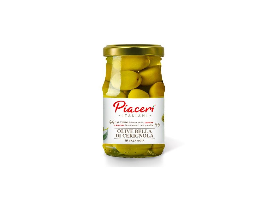 Olive Bella di Cerignola od značky Piaceri patří mezi nejznámější a nejcennější italské olivy. Pocházejí z oblasti Apulie, která je pro tuto odrůdu typická. Olivy jsou výrazně velké, masité a mají nádherně pevnou, ale šťavnatou strukturu.